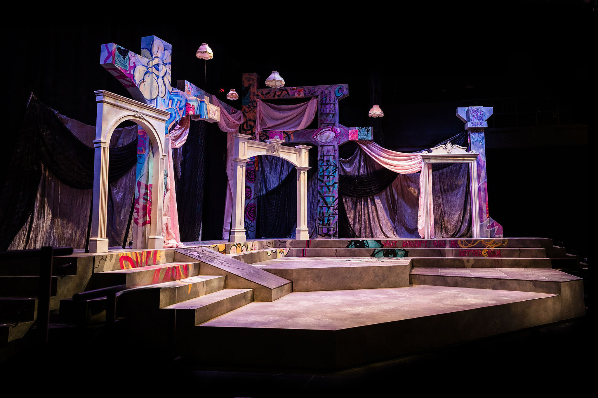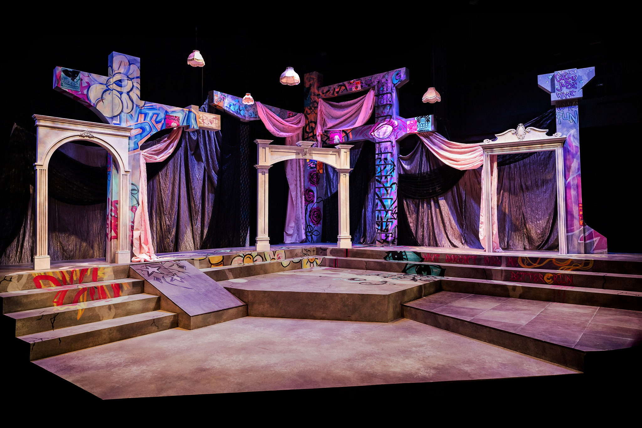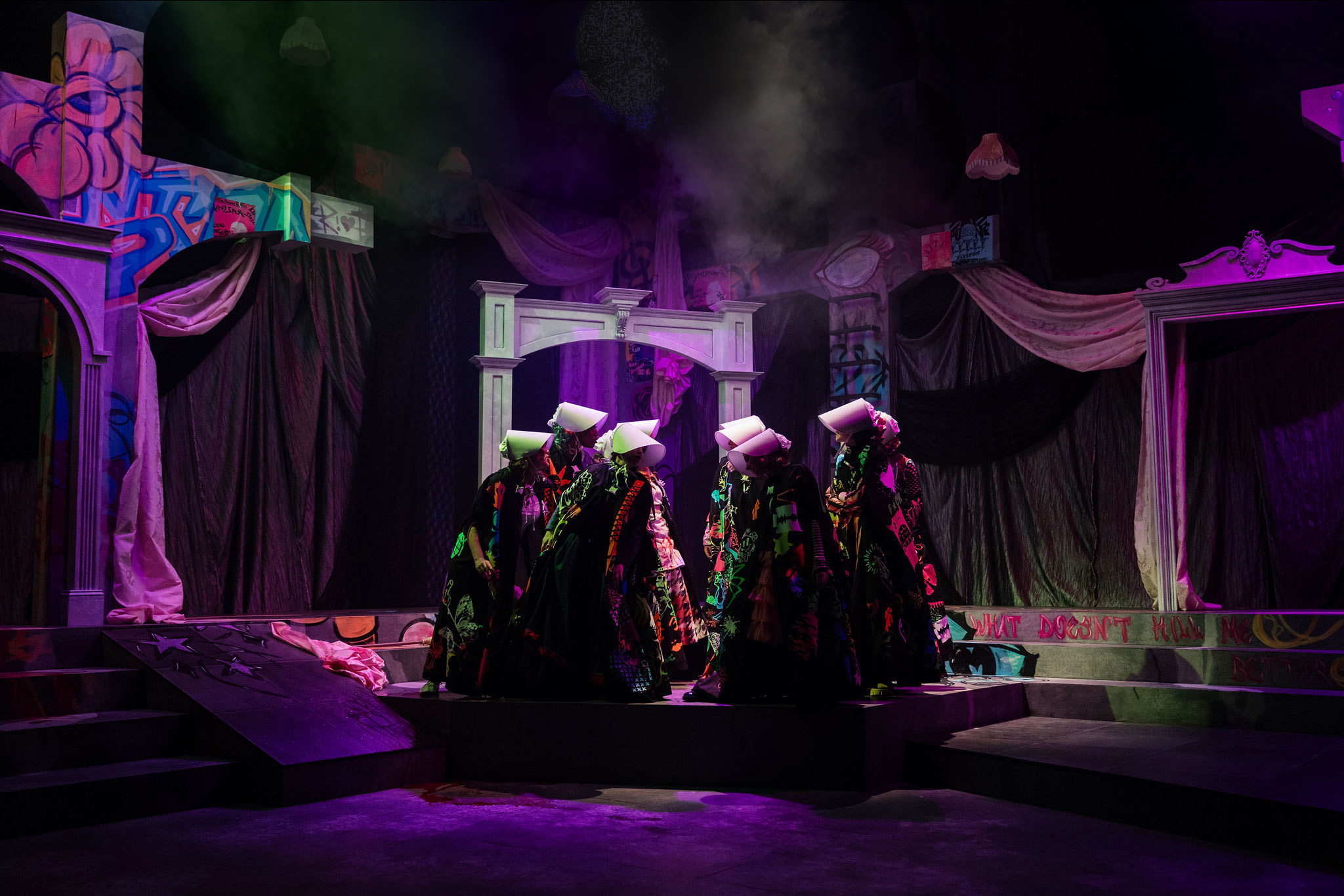 An abstract concrete building has been overtaken by this coven of women, redesigned into a girly, punky, rebellious haven. Classically ornamented marble arches harken to the historic periods of each storyline. Graffiti, fabric, and invisible blacklight paint transport us to modern girl punk.
