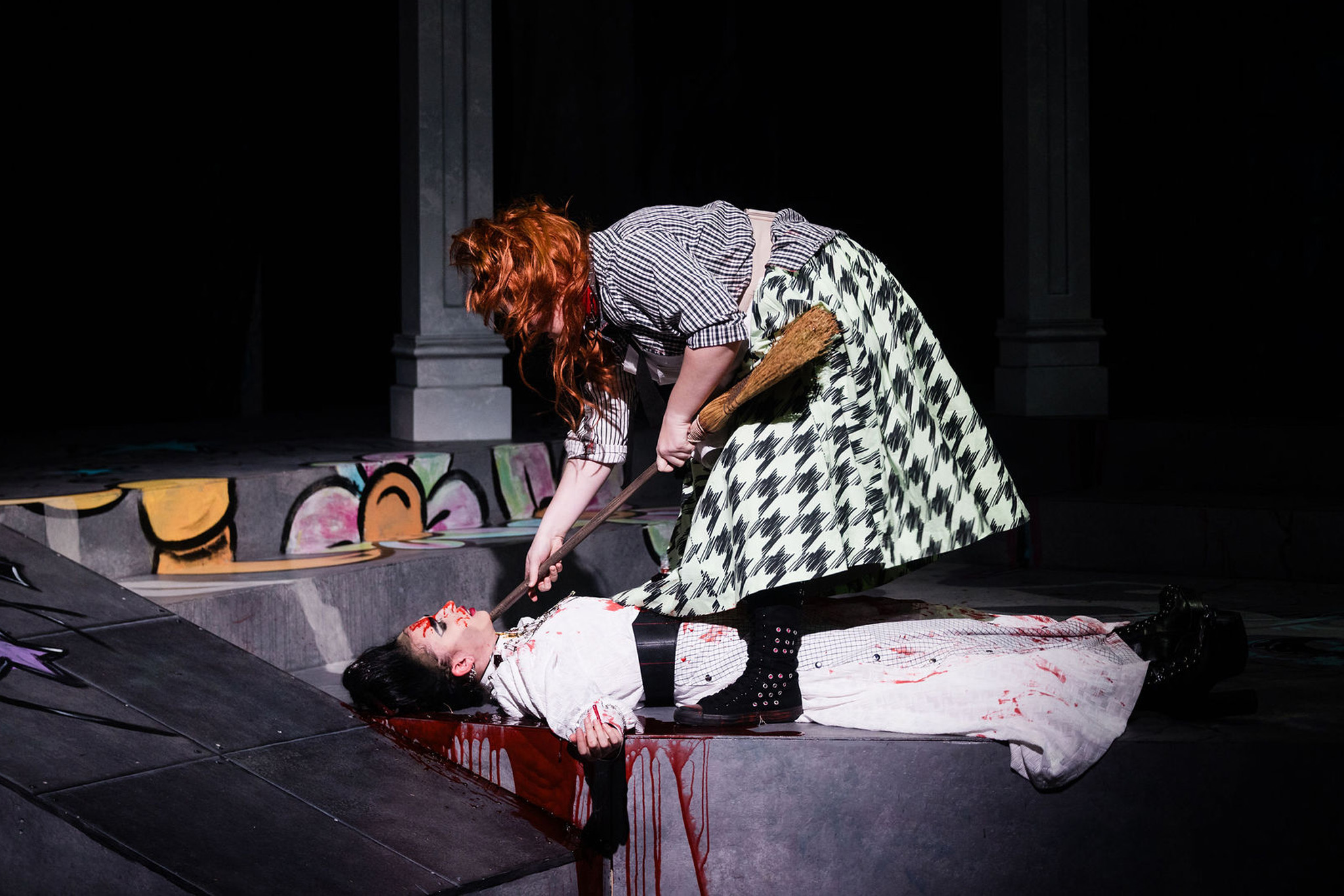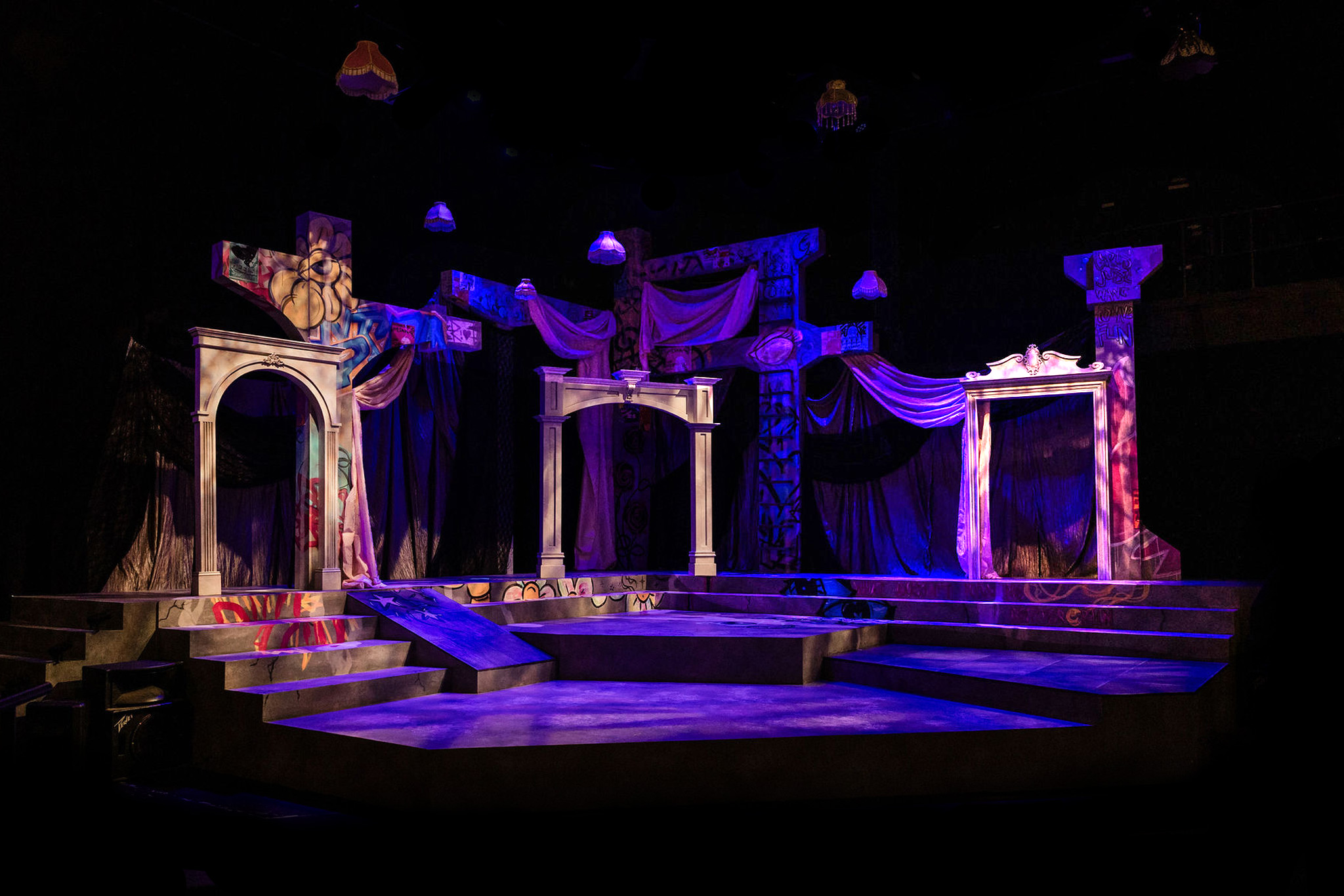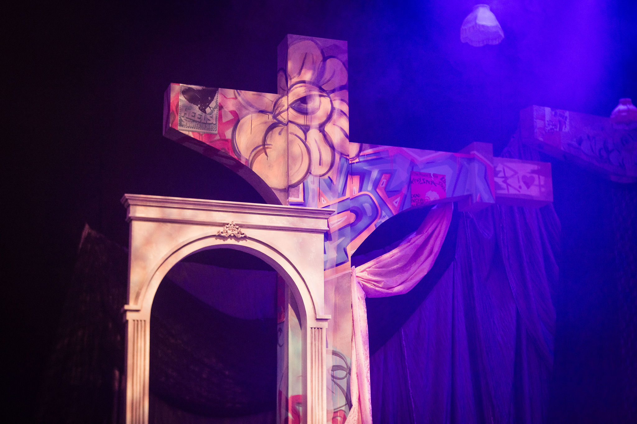 An abstract concrete building has been overtaken by this coven of women, redesigned into a girly, punky, rebellious haven. Classically ornamented marble arches harken to the historic periods of each storyline. Graffiti, fabric, and invisible blacklight paint transport us to modern girl punk.